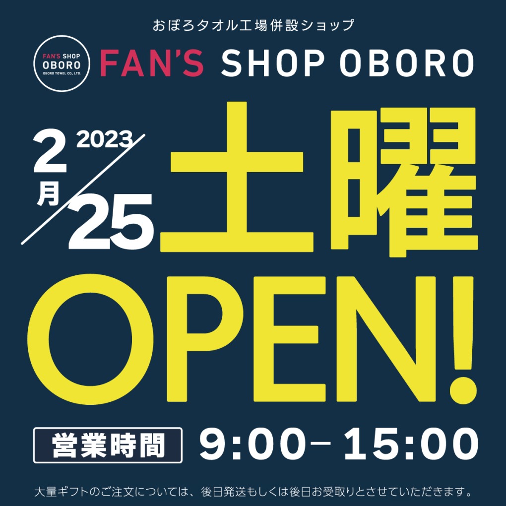 おぼろタオル工場併設ショップ「FAN’S SHOP OBORO」は、2月23日(木祝)9時~17時と今週末の25日(土)9時~15時は営業しております。お休みの方は、ぜひこの機会にゆっくりお買い物を楽しんでください。入浴時に便利なタオルや、春の贈答タオルもラインナップ豊富に取り揃えております!